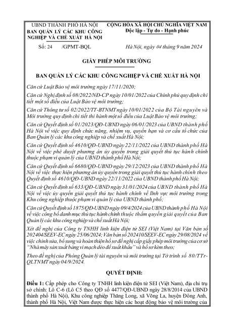 Giấy phép môi trường nhà máy 1 số 24/GPMT-BQL
