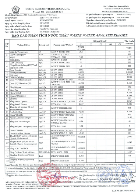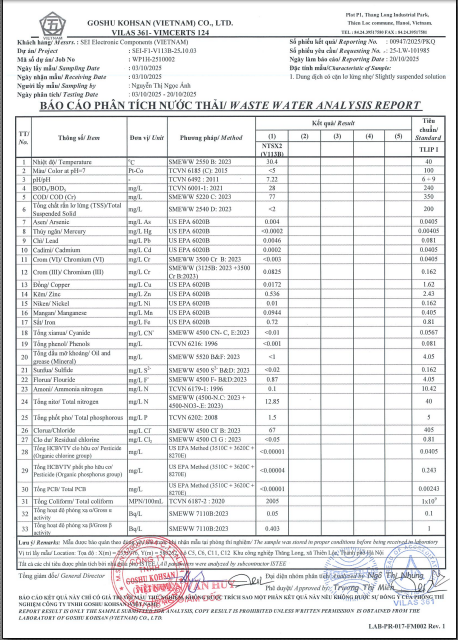+ Kết quả phân tích nước thải hệ thống số 1: NTSX01 (V113A)