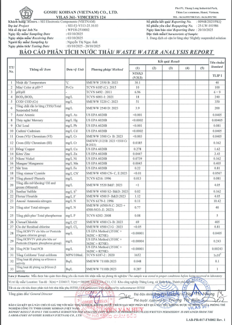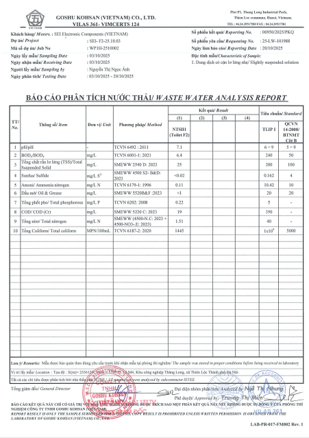 1. Kết quả phân tích chất lượng nước thải công nghiệp nhà máy 1 tháng 10/2025