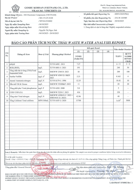 2. Kết quả phân tích chất lượng nước thải sinh hoạt các nhà máy tháng 10/2025